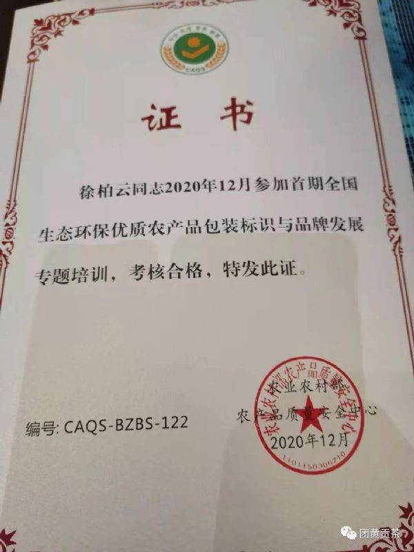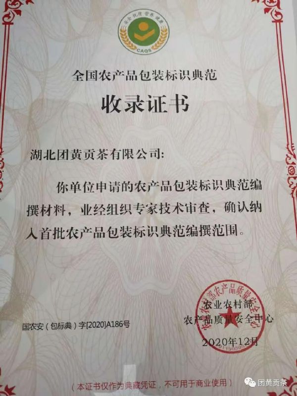 為響應(yīng)號(hào)召,湖北團(tuán)黃貢茶有限公司積極參與農(nóng)業(yè)農(nóng)村部農(nóng)業(yè)農(nóng)村部農(nóng)產(chǎn)品質(zhì)量安全中心組織的首期全國生態(tài)環(huán)保優(yōu)質(zhì)農(nóng)產(chǎn)品包裝標(biāo)識(shí)與品牌發(fā)展專題培訓(xùn)班!團(tuán)黃牌英山云霧茶”包裝榮獲全國首批農(nóng)產(chǎn)品包裝標(biāo)識(shí)百家典范稱號(hào)。