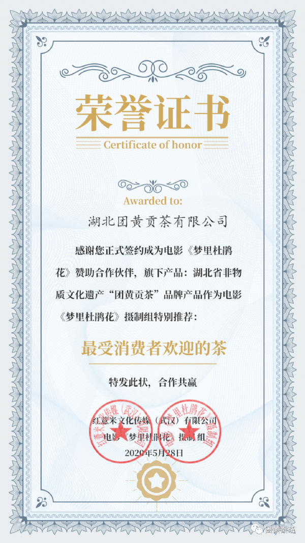 電影《夢里杜鵑花》日前正式與湖北團黃貢茶有限公司成功簽約成為贊助合作伙伴:"團黃貢茶"正式成為電影《夢里杜鵑花》特別推薦:最受消費者歡迎的茶。